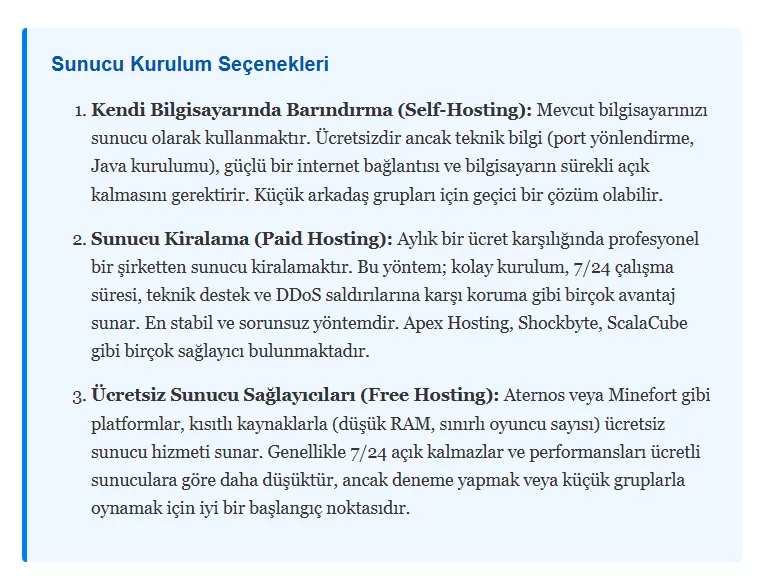 Arkadaşlarınızla özel bir dünyada oynamak veya kendi topluluğunuzu oluşturmak için bir sunucu kurmayı düşünebilirsiniz. Bunun için temel olarak üç ana yol bulunur: