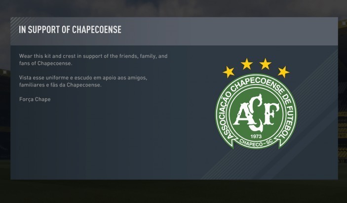 Bugün FIFA 17 Ultimate Team moduna giren oyunculara, Chapecoense takımının kitini ücretsiz olarak sunan EA mesajda “Chapecoense’li taraftarları, aileleri ve arkadaşları desteklemek için bu kiti giyin” ifadelerine yer verdi. Mesaj aynı şekilde Portekizce olarak da paylaşılıyor.