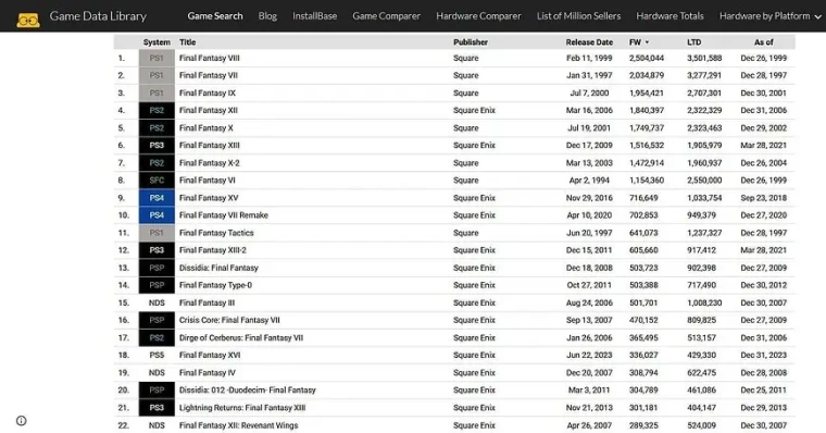 Aşağıdaki listeden de anlaşılacağı gibi, PS4 döneminde başlayan Final Fantasy serisinin satışları Japonya’da önemli ölçüde düştü. PS3’te Final Fantasy 13 çıkmadan önce, Final Fantasy 6’dan başlayarak serinin her önceki bölümü, piyasaya çıktıktan sonraki ilk haftada 1 milyondan fazla kopya satıyordu. Ancak her şey 2016 yılında Final Fantasy 15’in çıkışı ile değişti, oyun PS4 platformunda ilk haftada 716,649 kopya sattı. Bu oyunu Final Fantasy VII Remake izledi, serinin en popüler bölümünün yeniden düşünülmüş versiyonu. Ancak bile bu, seriyi eski ihtişam günlerine geri getirebilmek için yeterli olmadı: Japonya’da ilk haftada 702,853 kopya satıldı, bu bile bu ülkede ilk hafta satışlarından daha düşüktü Final Fantasy 15’in.
