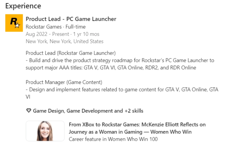 Bu bilgi, McKenzie Elliott’ın Rockstar Games’te PC Oyun Başlatıcısı departmanından sorumlu olan bir profilinde bulundu. Profil fotoğrafında GTA VI’ye dair işaretler bulunuyor.