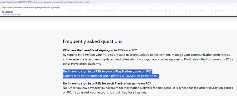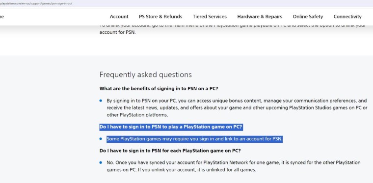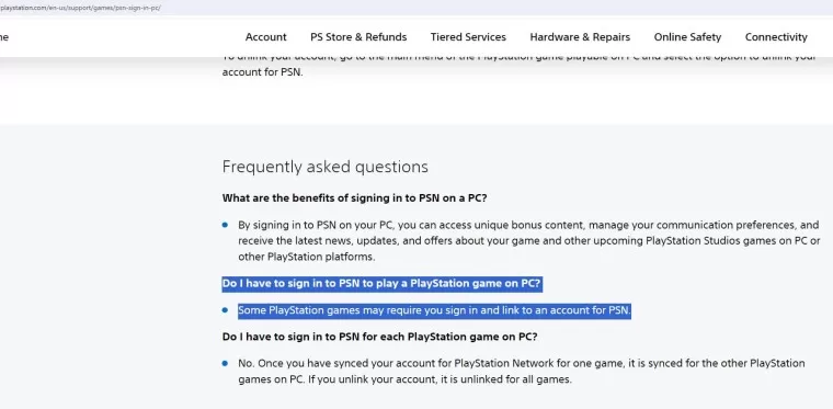 2022 yılında Sony, PC oyuncularının PlayStation Network hesabına sahip olması zorunlu olmayacağını açıkladı. PlayStation oyunlarını PC’de oynarken PSN hesabına girişin isteğe bağlı olduğunu belirttiler. Bu bilgi, Sony’nin 2022 yılında başlattığı PlayStation Network destek sayfasından alınmıştır.