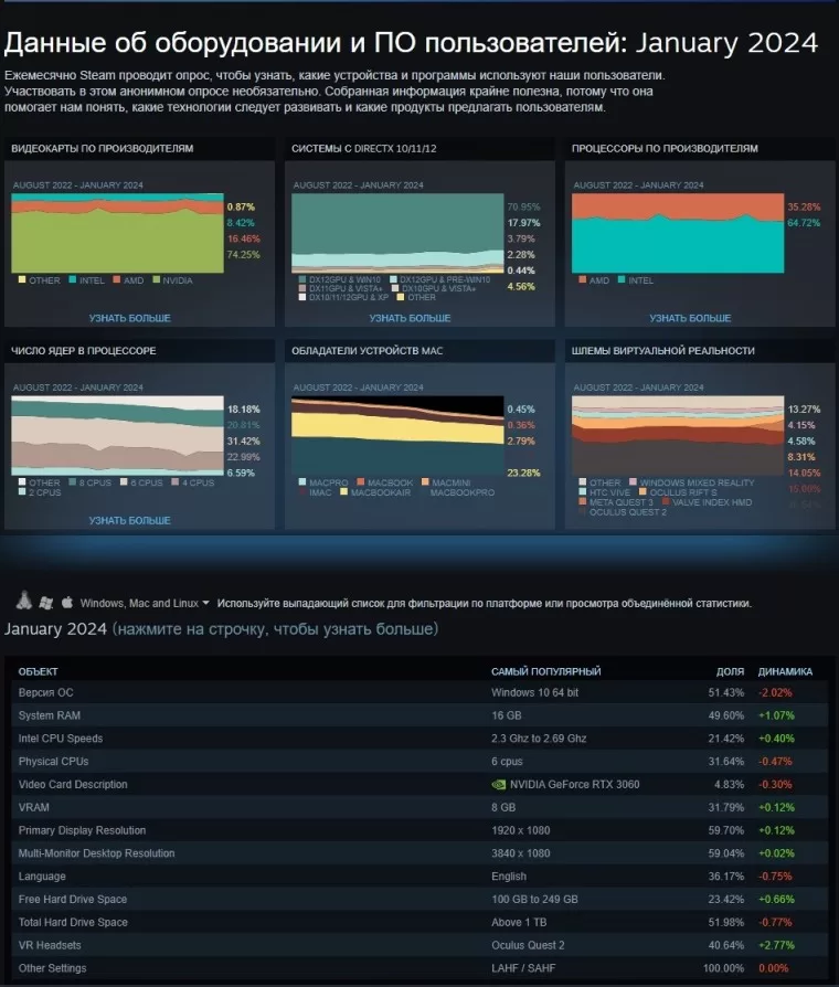 Ocak ayı raporunda Valve şirketi, Steam kullanıcılarının kullandığı donanım hakkında verileri sunmuştur.