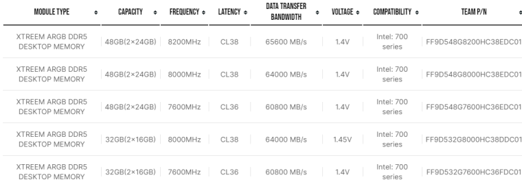 • 48 GB (2×24 GB) 8200 MHz (CL38-49-49-84) 8000 MHz (CL38-49-49-84) 7600 MHz (CL36-47-47-84)